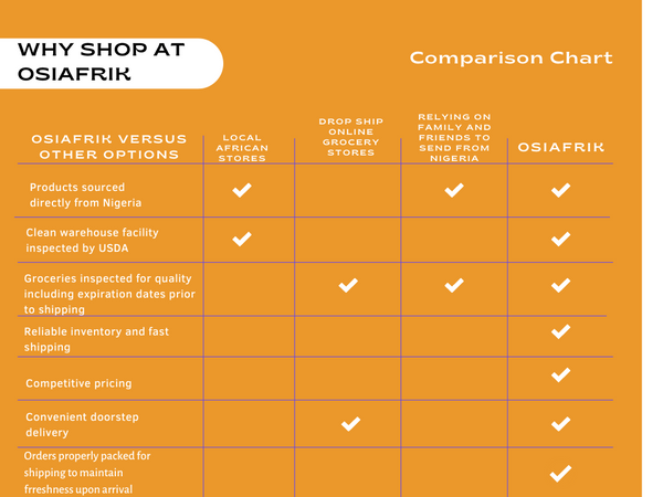 At OsiAfrik we provide a hassle-free and convenient shopping experience while providing top quality authentic Nigerian food products. Our customer's satisfaction is our top priority.